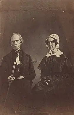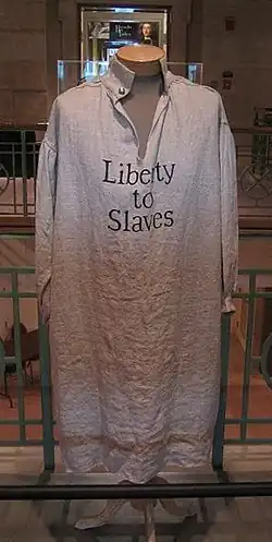 African slaves arrived in the Massachusetts Bay Colony in the 1630s, and slavery was legally sanctioned by the Puritans in 1641.[103] Massachusetts residents participated in the slave trade, and laws were passed regulating the movement and marriage among slaves.[103] In 1700, Samuel Sewall, Puritan abolitionist and associate justice of the Massachusetts Superior Court of Judicature, wrote The Selling of Joseph, within which he condemned slavery and the slave trade and refuted many of the era's typical justifications for slavery.[104][105] The Puritan influence on slavery was still strong at the time of the American Revolution and up until the Civil War. Of America's first seven presidents, the two who did not own slaves, John Adams and his son John Quincy Adams, came from Puritan New England. They were wealthy enough to own slaves, but they chose not to because they believed that it was morally wrong to do so. In 1765, colonial leader Samuel Adams and his wife were given a slave girl as a gift. They immediately freed her.