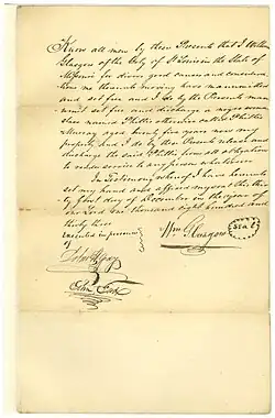 In early 1775, the royal governor of Virginia, Lord Dunmore, wrote to the Earl of Dartmouth of his intention to free slaves owned by American Patriots in case they staged a rebellion.[37][38] On November 7, 1775, Dunmore issued Dunmore's Proclamation, which promised freedom to any slaves of American patriots who would leave their masters and join the British forces.[39] Historians agree that the proclamation was chiefly designed for practical rather than moral reasons, and slaves owned by American Loyalists were unaffected by the proclamation. About 1,500 slaves owned by patriots escaped and joined Dunmore's forces. A total of 18 slaves fled George Washington's plantation, one of whom, Harry, served in Dunmore's all-black loyalist regiment called "the Black Pioneers".[40] Escapees who joined Dunmore had "Liberty to Slaves" stitched on to their jackets.[41] Most died of disease before they could do any fighting, but three hundred of these freed slaves made it to freedom in Britain.[42] Historian Jill Lepore writes that "between eighty and a hundred thousand (nearly one in five black slaves) left their homes ... betting on British victory", but Cassandra Pybus states that between 20,000 and 30,000 is a more realistic number of slaves who defected to the British side during the war.[40]