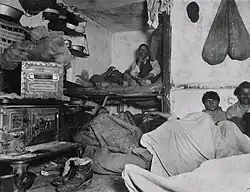 Slums are often associated with the British Isles during the Victorian era, particularly in industrial towns. Friedrich Engels described these neighborhoods as "cattle-sheds for human beings".[20] These were generally still inhabited until the 1940s, when the British government started slum clearance and built new council houses.[21] There are still examples left of slum housing in the UK, but many have been removed by government initiative, redesigned and replaced with better public housing. In Europe, slums were common.[22][23] By the 1920s it had become a common slang expression in England, meaning either various taverns and eating houses, "loose talk" or gypsy language, or a room with "low going-ons". In Life in London (1821) Pierce Egan used the word in the context of the "back slums" of Holy Lane or St Giles. A footnote defined slum to mean "low, unfrequent parts of the town". Charles Dickens used the word slum in a similar way in 1840, writing "I mean to take a great, London, back-slum kind walk tonight". Slum began to be used to describe bad housing soon after and was used as alternative expression for rookeries.[24] In 1850 the Catholic Cardinal Wiseman described the area known as Devil's Acre in Westminster, London as follows:
