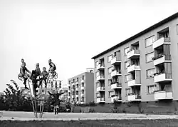 Housing project in Bremen-Vahr in the 1960s, back then most tenants living in housing-projects were two-parent families with at least one parent working. In many housing projects, the composition of tenants has changed since then and now many tenant-families are headed by a single female or an unemployed male.