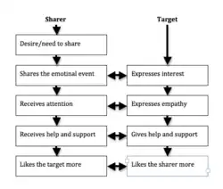According to Rimé,[1] if the social sharing experience is a pleasant one, it could help to strengthen socio-affective links between the two people. As seen in the diagram, social sharing can result in reciprocal affection between the two people involved, and can play an obvious role in attachment. When the social sharing is done between partners in an intimate relationship, it could be seen as a reinforcement of their affective bond.
