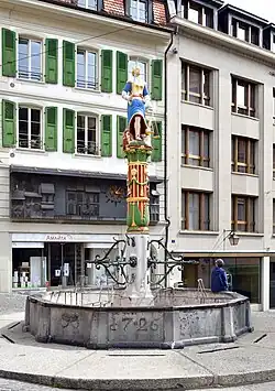 Fountain de la Justice which features the attributes of jurisprudence and justice. Switzerland.