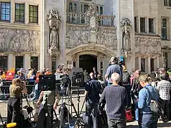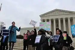 Legal systems and society. Top-left: Congresswoman Marcy Kaptur (D-OH), Dean of the Ohio Delegation, spoke at a press conference at the U.S. Supreme Court to defend voter rights in Ohio. Top-right: Protests and press outside the Supreme Court of the United Kingdom. Bottom-right: upclose image of the Supreme Court of India.