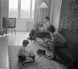 Since unemployment was rendered unviable through various acts of legislation, the Soviet worker, in contrast to a Capitalist worker, was more secure economically.[10] In return for working, a Soviet worker would get an individual return in the form of a money wage; however, during the period under the New Economic Policy (1920s), hyperinflation rendered money effectively useless, and wages sometimes occurred through bartering . Money wage in Soviet parlance was not the same as in Capitalist countries.[2] The money wage was set at the top of the administrative system, and it was the same administrative system which also set bonuses. Wages were 80 percent of the average Soviet worker's income, with the remaining 20 percent coming in the form of bonuses. The Soviet wage system tried systematically to make wages more equal; for instance, the relationship between wages was termed "ITRs", a measure of comparing wages across occupations. For engineers and other technical workers ITR was 1.68 in 1955, but had decreased to 1.21 in 1977.[11] Social wages were also an important part of the general standard of living for an average household; it stood at 23.4 percent of income for the average Soviet worker and their family, and at 19.1 percent for the family income of collective farmers. In the period between 1971 and 1981, the social wage grew faster than the money wage; the money wage grew by 45 percent for workers and employees and 72 for workers at collective farms. In contrast, per capita income from social wages increased by 81 percent. Social wage took many forms; it could be improved health, education, transport or food subsidies, which was the responsibility of the state, or the improvement (or introduction) of sanitation and working facilities.[2]