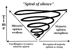 The spiral of silence theory is a political science and mass communication theory which states that an individual's perception of the distribution of public opinion influences that individual's willingness to express their own opinions.[1][2] Also known as the theory of public opinion, the spiral of silence theory claims individuals will be more confident and outward with their opinion when they notice that their personal opinion is shared throughout a group. But if the individual notices that their opinion is unpopular with the group, they will be more inclined to be reserved and remain silent. In other words, from the individual's perspective, "not isolating themself is more important than their own judgement", meaning their perception of how others in the group perceive them is more important to themself than the need for their opinion to be heard.[3]