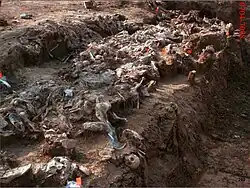 Some executions were carried out at night under arc lights, and bulldozers then pushed the bodies into mass graves.[83] According to evidence collected from Bosniaks by French policeman Jean-René Ruez, some were buried alive; he heard testimony describing Serb forces killing and torturing refugees, streets littered with corpses, people committing suicide to avoid having their noses, lips and ears chopped off, and adults being forced to watch soldiers kill their children.[83]