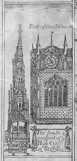 England's Statute of Labourers 1351 prescribed the use of the stocks for "unruly artisans" and required that every town and village erect a set of stocks.[8] In towns and cities they were commonly placed in prominent central locations, such as the one before Bristol's High Cross. The 1351 Act was repealed in 1863.[9] Sources indicate that the stocks were used in England for over 500 years and have never been formally abolished.[10]