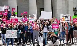 Stop the Bans was a series of rallies held in the United States on May 21, 2019, protesting abortion bans and restrictions. Supporting organizations include the American Civil Liberties Union (ACLU), NARAL Pro-Choice America, and Planned Parenthood.[1] Protesters at the Stop the Bans rallies were concerned about women's rights being eroded.[2] Demonstrators at the rallies felt that politicians should not be making medical decisions about women's bodies.[3]