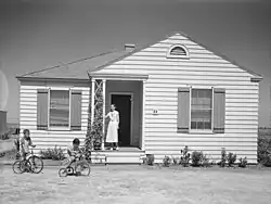 The Subsistence Homesteads Division (or Division of Subsistence Homesteads, SHD or DSH) of the United States Department of the Interior was a New Deal agency that was intended to relieve industrial workers and struggling farmers from complete dependence on factory or agricultural work.[1] The program was created to provide low-rent homesteads, including a home and small plots of land that would allow people to sustain themselves. Through the program, 34 communities were built.[2] Unlike subsistence farming, subsistence homesteading is based on a family member or members having part-time, paid employment.[3] However the new residents were not allowed to purchase the new homes.