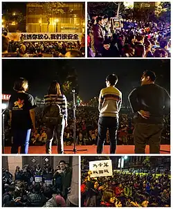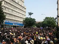 On March 27, Lin Fei-fan called for a March 30 rally filling the Ketagalan Boulevard leading from the Presidential Office to the legislature to put pressure on President Ma to heed the demonstrators' demands.[44][45] The organizers behind the demonstration said around 500,000 people massed in the March 30 rally, while the police estimated the figure to be 116,000.[46] Twenty-two NGOs also took part in the rally.[47] Hundreds of people opposing the movement held a concurrent rally in the same area, but left before the students dispersed.[48]