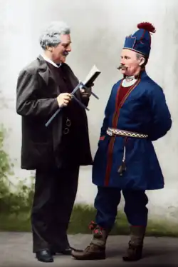 For Sámi, different groups were segregated into reindeer herders, who continued a more nomadic life and were considered less developed, and farmers who were deemed by the government to be Swedes and not Sámi. This Lapp skall vara Lapp (lit. 'Lapp shall be Lapp') policy forced different schooling on settled children versus nomadic children.[7] By the late 1800s, Swedish became the sole language of instruction in the Torne Valley, which was populated largely by Meänkieli speakers.[8] In the 1930s, boarding schools were set up for Tornedalian and Sámi children, where they were barred from speaking their native languages and encouraged to adopt "civilized" norms.[9][10]