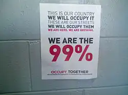 "We are the 99%" is a political slogan and an implicit economic claim of "Occupy" protesters. It refers to the increased concentration of income and wealth since the 1970s among the top 1% of income earners in the United States.[26]