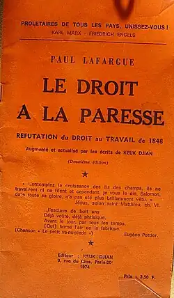 The Right to Be Lazy (French: Le Droit à la paresse) is a book by Paul Lafargue, published in 1883. In it, Lafargue, a French socialist, opposes the labour movement's fight to expand wage labour rather than abolish or at least limit it. According to Lafargue, wage labour is tantamount to slavery, and to fight as a labour movement for the extension of slavery is preposterous.[1] In the book, Lafargue proposes the right to be lazy, in contrast to the right to work, which he deems bourgeois.