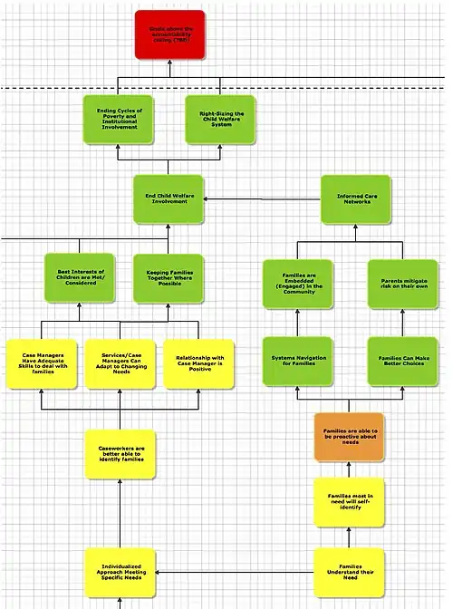 In addition to these three basic quality control criteria, ActKnowledge[13] has added another key criterion: Appropriate Scope. An actionable theory that can be communicated to the key audiences is dependent in part upon choosing the right scope: broad enough to leave no gaps in the model, yet focused enough on the opportunities and resources at hand. Appropriate Scope also integrates the evaluation concept of “accountability”. Many Theory of Change outcome pathways include an “accountability ceiling,” often a dashed line drawn across the pathway that separates outcomes the organization will monitor and claim credit for attaining from higher-order outcomes that are beyond its power to achieve—e.g., “a just society.”[20]