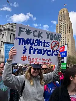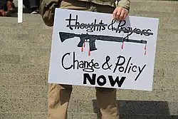 After the Stoneman Douglas High School shooting in February 2018, demands for "policy and change" were used as a pithy rejoinder to the typical "thoughts and prayers" offered by politicians.[43] Student survivors of the shooting[44] were joined by religious leaders in calling for concrete legislative actions.[45]