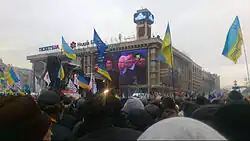 At noon of 28 November (the eighth day of protests) about 3,000 people gathered on Maidan Nezalezhnosti; no party symbols were reported, only Ukrainian flags and European Union flags.[22] The crowd grew to 4,000 by the evening while it was again entertained by popular Ukrainian artists.[22][26]