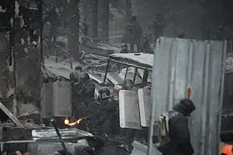 Clashes erupted as thousands descended upon parliament via Hrusehvskoho Street, and were met by police cordons, and a blockade of military cars, mini-vans and buses.[268][269] The protests escalated into riots and clashes with police erupted. The riots on Hrushevskoho Street have been ongoing from 19–21 January and have involved both Euromaidan activists and opposition leadership.