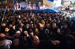 Euromaidan (Ukrainian: Євромайдан, romanized: Yevromaidan, lit. 'Euro Square'[nb 1], Russian: Евромайдан, Jevromajdán) was a wave of demonstrations and civil unrest in Ukraine, which began on the night of 21 November 2013 with large public protests demanding closer European integration. Protesters also stated they joined because of the dispersal of protesters on 30 November and "a will to change life in Ukraine".[4] The scope of the protests evolved over subsequent months,[5] and by 25 January 2014 the protests were fueled by the perception of widespread government corruption, abuse of power, and violation of human rights in Ukraine.[6] By February 2014 the protests had largely escalated into violence, resulting in the Revolution of Dignity and the resignation of Azarov's government and ousting of President Yanukovych. This resulted in the outbreak of the Russo-Ukrainian War.