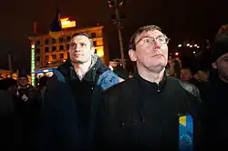In response to the agreement, the opposition parties blocked parliament in order to defer its ratification since they quickly denounced the plan.[188][189] And approximately 50,000 continued their protest on Maidan Nezalezhnosti.[190] Where opposition leader Vitaly Klitschko told the crowd "He [President Yanukovich] has given up Ukraine's national interests, given up independence and prospects for a better life for every Ukrainian".[191] The opposition leaders vowed to continue their protests, if necessary through New Year and Orthodox Christmas (celebrated on 7 January annually), they repeated their demands for the firing of the second Azarov Government, early presidential and parliamentary elections.[189]