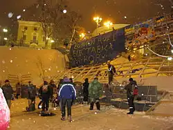 The day after the riots, peaceful protests continued to take place and occupy Maidan Nezalezhnosti in Kyiv, with tens of thousands attending, while thousands blocked the main Cabinet buildings.[47] According to BBC correspondent David Stern "They have set up almost a military camp of sorts, and have erected a very impressive barricade around the perimeter of the demonstration".[48] David M. Herszenhorn of The New York Times described the square as "oddly festive" and added that "Protest leaders, sensing that momentum had turned to their advantage, continued to add infrastructure to their operation, bringing in television monitors and erecting the small tent city".[49] Elsewhere, Lviv, Ternopil and Ivano-Frankivsk announced a general strike in solidarity with the movement.[50] 1,000 Internal Troops (National Guard) were deployed to Kyiv around key government buildings by the Interior Ministry. The parliament committee on statehood and self-governance recommended a vote of no-confidence in Prime Minister Mykola Azarov's government, opening a way for such a vote on 3 December. The Kyiv City Council building remained occupied by protesters.[51][nb 2] Workers at Kyiv City Council were still allowed to enter and work.[47][nb 3]