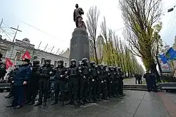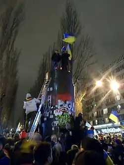 After the rally, a large group of Ukrainian protesters toppled the statue to Lenin in Kyiv.[99] Unlike the previous week, police officers on the scene withdrew without attempting to defend the monument.[100] After the statue was taken down, the group shouted "Yanukovych, you'll be next!", and proceeded to smash the statue with a sledgehammer, decapitate it, and dismantle it for souvenirs;[101][102] in place of the statue was planted a Ukrainian and red-and-black insurgency flag.[100] The Svoboda party took credit for the statue's destruction, with several party MPs, including Ihor Miroshnichenko, joining the crowd and taking part in the act.[102][103]