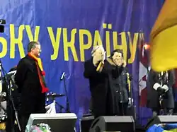 On 22 December, the fifth ongoing week of the protests, 100,000 rallied in Kyiv.[210] During this day major opposition parties and non-partisans established a nationwide political movement called Maidan People's Union.[211][212] And Klitschko told the crowds "We won't leave this place in any case. I'm inviting you to stand and celebrate the New Year here, on the Maidan".[213]