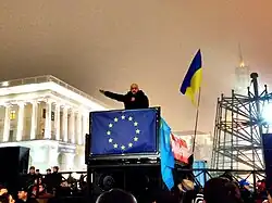 Approximately 2,000 people converged in the evening of 22 November on Maidan Nezalezhnosti (Independence Square) to protest the decision of the Ukrainian government to suspend the process of integration of Ukraine into the European Union.[12] In the following days, the opposition and pro-EU parties led the protests.[13]