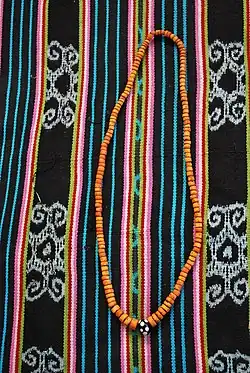 From the groom's family come gifts associated with wealth creation, such as water buffalo, which pull ploughs in paddy fields. From the bridal side come items produced by women, such as the tais cotton fabrics typical of East Timor, or pigs, which are considered soft and feminine objects and are usually tended to by the women. There are also many other objects that also depend on the respective ethnic group, including jewellery such as mutissala beads, chains or old jewellery and coins made of gold or silver. The barlake is part of the obligation of the bride's new host family to protect her and the couple's children.[1]