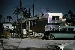 In the mid-20th century, poor whites who could not afford to buy suburban-style tract housing began to purchase mobile homes, which were not only cheaper but could be easily relocated if work in one location ran out. These – sometimes by choice and sometimes through local zoning laws – gathered in trailer parks, and the people who lived in them became known as "trailer trash" with the term dating to at least 1952.[4] Despite many of them having jobs, albeit sometimes itinerant ones, the character flaws that had been perceived in poor white trash in the past were transferred to trailer trash, and trailer camps or parks were seen as being inhabited by retired people, migrant workers, and, generally, the poor. By 1968, a survey found that only 13% of those who owned and lived in mobile homes had white collar jobs.[5]