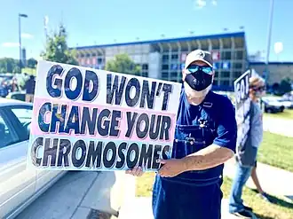 Public opinion in the United States about transgender people is often similar to attitudes about LGBTQ individuals, with the difference being that "attitudes towards transgender individuals are significantly more negative."[28] Data published in 2024 showed 80% of Americans supported LGB people living as they choose, but only 67% supported the same for transgender people.[29] Some anti-transgender attitudes are based on the idea that gender is "natural and so, by extension, transgender people are unnatural."[30] Because some Americans believe transgender people are unnatural, that also automatically makes them dangerous in their perceptions.[30] Others argue that their religious beliefs prohibit them from using gender identity in place of biological sex,[31] although the Bible does not mention trans people.[32]