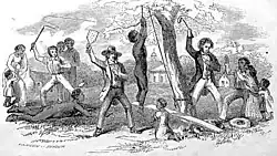 Slaves were punished for a number of reasons: working too slowly, breaking a law (for example, running away), leaving the plantation without permission, insubordination, impudence as defined by the owner or overseer, or for no reason, to underscore a threat or to assert the owner's dominance and masculinity. Myers and Massy describe the practices: "The punishment of deviant slaves was decentralized, based on plantations, and crafted so as not to impede their value as laborers."[22] Whites punished slaves publicly to set an example. A man named Harding describes an incident in which a woman assisted several men in a minor rebellion: "The women he hoisted up by the thumbs, whipp'd and slashed her [sic] with knives before the other slaves till she died."[23] Men and women were sometimes punished differently; according to the 1789 report of the Virginia Committee of the Privy Council, males were often shackled, but women and girls were left free.[23]