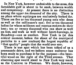 Upper Ten Thousand, or simply, The Upper Ten, is a 19th-century phrase referring to the wealthiest 10,000 residents of New York City. The phrase was coined in 1844 by American poet and author Nathaniel Parker Willis.[1] Soon, the term came to be used to describe the upper circles not only of New York, but also those of other major cities.[2]