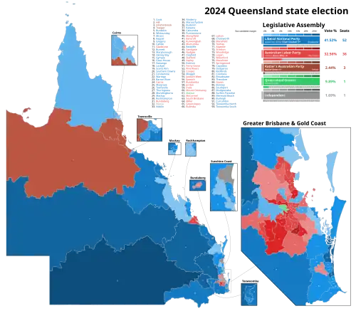 Trends in provincial elections are broadly similar. After the 2023 Alberta general election, which saw the United Conservative Party win a majority government despite losing many urban seats, Paul Kellogg of Athabasca University called the urban–rural divide "one of the most important political questions of our generation".[12] Jared Wesley, a political scientist at the University of Alberta, suggested that although the policy differences between the two main parties in Alberta are small, each one appeals to different cohort of people based primarily on a sense of identity, where many rural voters instinctively label themselves as conservative even if they have centrist or centre-left policy preferences. To a lesser extent, urban voters may also label themselves as progressive without regard to policy preferences but the conservative identity has a much older and more durable image in the Albertan cultural imagination.[13] After the 2022 Quebec general election, columnist Emile Nicolas described the province as being split in two, between a liberal Montreal as an island in an otherwise conservative and nationalist province.[14] In the 2024 Saskatchewan general election, the Saskatchewan Party similarly maintained its majority government by dominating rural areas, despite major losses of urban ridings to the Saskatchewan New Democratic Party; historian Ken Coates believed that neither party presented a platform that successfully appealed to both audiences.[15][16][17]