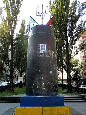 The statue was toppled from its pedestal and crushed by protesters on 8 December 2013, as part of the Euromaidan events, when many other Soviet statues were toppled. The plinth remains in place,[1] and has become at times a site of political artwork, and arguments.[2] Since 2016 various sculptures or installations have been exhibitioned in front of the plinth.[1]