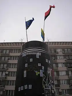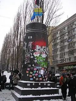- ↑ "Protesters rid Kyiv of Lenin statue". Kyiv Post. 8 December 2013. Archived from the original on 9 December 2013. Retrieved 5 April 2014.
