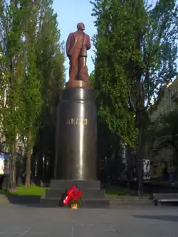 The removal or destruction of Lenin monuments and statues gained particular momentum after the destruction of the Kyiv Lenin statue. Under the motto "Ленінопад" (Leninopad, translated into English as "Leninfall"), activists pulled down a dozen communist monuments in the Kyiv region, Zhytomyr, Khmelnytskyi, and elsewhere, or damaged them during the course of the EuroMaidan protests into spring of 2014.[9] In other cities and towns, monuments were removed by organised heavy equipment and transported to scrapyards or dumps.[10][11]