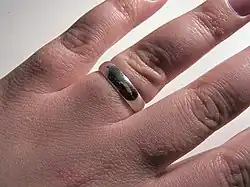 A wedding ring or wedding band is a finger ring that indicates that its wearer is married.[1] It is usually forged from metal, traditionally gold or another precious metal. Rings were used in ancient Rome during marriage.[2]