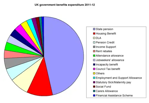 The Act was introduced by the Government of David Cameron as part of the programme of austerity with the aim of reducing the amount of welfare spending in the United Kingdom.[18][19] In 2011–12, the Department for Work and Pensions reported a welfare expenditure of over £159 billion, approximately 22.8% of total government spending.[20] The government heading of Welfare Expenditure covers payments made by the Department for Work and Pensions only, and does not include the cost of the tax credit system (covering in-work benefits) or child benefit, which are both paid by HMRC, making the total amount significantly larger.