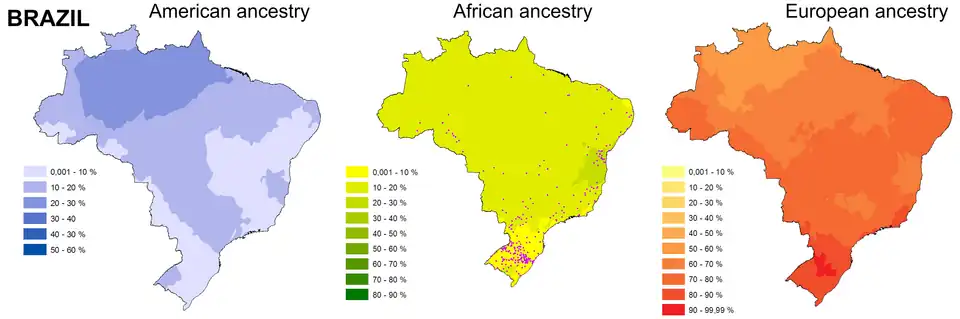 This does not mean that the majority of the population in these regions is "white"; on the contrary, due to the high degree of miscegenation between Europeans, Africans and Amerindians, in the North and Northeast regions of Brazil only a minority is white, and the majority identify themselves as “brown” in the censuses;[39] however, the genetic composition of these regions, with a predominance of European ancestry, particularly Portuguese, highlights the genetic legacy inherited from Portuguese colonization and the complex miscegenation that occurred back then.[40]