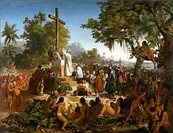 In addition to the fact that marriageable Portuguese women who arrived in Brazil were rare, the few remaining white women often remained celibate, as it was a tradition among aristocratic or richer white families to send their daughters to Catholic convents, where they would follow a religious life.[30] Given this absence of white women available for marriage, it was inevitable for Portuguese colonists to take as a lover a woman of African or indigenous origin. The Portuguese Crown's concern about the scarcity of marriages among whites in the colony became evident in 1732, when John V of Portugal prohibited women from leaving Brazil, with some exceptions. In order to curb miscegenation, in a royal decree of 1726, the king demanded that all candidates for positions in the municipal councils of Minas Gerais had to be whites and husbands or widowers of white women. Restrictive measures like this, however, would not be able to restrict the natural tendency to miscegenation in colonial Brazil.[30]