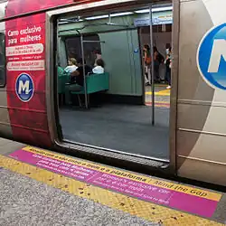 In April 2006, the Rio de Janeiro Metro implemented the mandate established by state law. It was passed in the previous month to have dedicated passenger cars for women to avoid sexual harassment. For trains with six passenger cars, one subway car is marked with pink colors as exclusive for women, and the women-only restriction applies from Monday through Friday during the rush hours, between 6:00 and 9:00 and between 17:00 and 20:00. There is metro police enforcement to prevent men from boarding the dedicated passenger car, and the platform has a sign on the floor indicating the boarding point for women-only cars.[2]