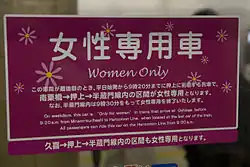 In July 2002, JR West became the third company in Japan to run trains with women-only cars, and the JR West trains in Osaka became the first to offer women-only cars during morning rush hour. The same year, two more Osaka-area railways, Hankyu Railway and Keihan Railway, added women-only cars to their limited express trains, and Hankyu became the first company to run women-only cars all day long.[10] Other Osaka-area companies followed suit, including Osaka Municipal Subway, whose Midosuji Line, which carries passengers at as much as 160% capacity, had a reputation for having the worst groping problem in all of Japan. Tokyo-area companies resisted the change because of logistical difficulties and fear of overcrowding in mixed-gender cars, but in 2005 they introduced women-only cars during rush hour, after awareness campaigns and tougher sentencing proved ineffective.[13]