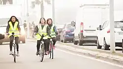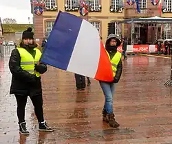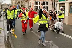 There were around 100 women at the march in Metz, 200 in Douai, and around 300 in Saint-Brieuc. Another 20 women accompanied by around a dozen men marched in Le Mans.[54] In Paris, where several hundred women participated, marchers met on the steps of Opera Bastille, before marching to Place de la République.[43][44][56] One participant in Paris was 40-year-old Sophie Tissier.[53][45][55] Around 300 women marched in Toulouse, their march starting at Place Arnaud-Bernard with a heavy police escort.[43][53] They marched behind a banner that read, "Subverted, discriminated against, rebellious, Women on the front line". (French: "Précarisées, discriminées, révoltées, Femmes en première ligne.")[44][53] Around one hundred women participated at the Caen march. Women brought their children with them, despite heavy violence in the yellow vest march the day before.[43] 28-year-old riding instructor Chloé Tessier said at the Caen march, "The government wants to make us look like thugs, but today we are mothers, grandmothers, we are the daughters, the sisters of all citizens, and we want to say that (...) our anger is legitimate. It is during social crises that women's rights are most at risk."[43][45] Another roughly one hundred women participated in a march in Saône-et-Loire.[43][44]