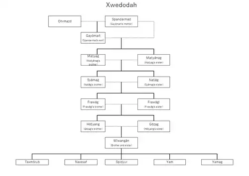 Xwedodah became a more solidified doctrine in the Pahlavi/Middle Persian literature of post-Sassanian Zoroastrianism.[3] In Zoroastrian cosmogony as explained by the Pahlavi text Bundahishn, Ahura Mazda is said to not have sired the other divine creations but rather to have fashioned or set them in their proper places and is referred to as both "mother", through spiritual nurturing, and "father", through material development, of all existence. The Denkard, which includes passages encouraging the action, and the Dadestan-i Denig both claim that not only was the world created through xwedodah, but humanity from the Consanguine marriage of Mashya and Mashyana, who were born from the spiritually-incestuous relationship of Keyumars (produced from xwedodah with Armaiti) and Spenta Armaiti, also developed from it to the pleasure of Ahura Mazda.[5][3][9] In the third book of the Denkard, which consists of a collection of Wisdom literature that can at times contradict itself, regarding an inquiry whether it was appropriate to marry a Hebrew, xwedodah is referred to not as consanguine marriage but rather as marriage within the faith which is viewed as providing honor and strength to those who engage in it and can include incestuous relationships of various kinds.[10] The Revayats, dating from the 1400s as a series of clerical communications, further solidify this broader view of xwedodah while encouraging the incestuous nature of it also noting that the practice had not been extant in centuries and the Shahnameh has it mentioned in passing.[5] According to the revayats, the marriage between a mother and her son is the most superior type of xwedodah, followed by that of father and daughter, which is followed by that of brother and sister. The xwedodah becomes even more superior if the mother/daughter is also the sister of her son/father.[11]
