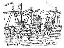 The next illustration shows a battle scene.[40]:365-66 The tactics included using grappling hooks to position the ships so that the archers on the aftcastles had clear shots into the opposing ship. After raking the deck with arrows, the men-at-arms would swing over to finish the job.