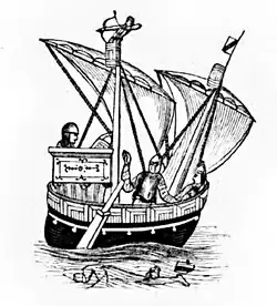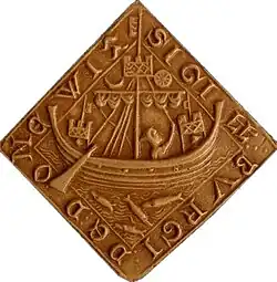 Seal of the port of Dunwich. This is an earlier ship (note the side rudder) which has been retro-fitted with a forecastle, aftcastle, and topcastle. The forecastle and aftcastle platforms are tall enough so men can stand underneath them.