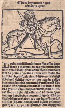 An early historical meaning that seems to have disappeared before our modern era is "something pertaining to or characteristic of a yeoman", such as the speech or the dress.[1] Perhaps the best way of illustrating this meaning is to quote briefly from one of the earliest Middle English ballads. Robin Hood and the Potter survives as a manuscript dated from about 1500.[25] Robin demands a one penny toll of the Potter, for which the traveler could then proceed unharmed by the outlaw. The Potter refuses to pay. A scuffle ensues, in which the Potter overcomes Robin. The Potter then wants to know whom he has beaten. After hearing Robin's name, the Potter responds (modern translation from glossary notes):[26]:lines 85–89