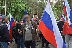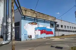 Local authorities in several parts of Russia have organized flash mobs in support of the invasion prominently featuring the symbol.[54] On social media, propaganda videos have been shared depicting flash mobs consisting of pro-war youth activists wearing black shirts decorated with the "Z" symbol and shouting, "For Russia, for Putin!", alongside the #СвоихНеБросаем (transl. #WeDon'tAbandonOurOwn) hashtag.[55][56] In a social media video, State Duma member Maria Butina drew a "Z" on her jacket to show support for the invasion and encouraged others to do so as well.[57] Russian state-controlled broadcaster RT has sold merchandise featuring the symbol as a show of support for Russian forces, often with a texture taken from the ribbon of Saint George.[54] Amazon sold "Z" symbol products in the UK,[58] but took down the listings on 8 March after receiving public criticism and media inquiries.[59][60] The "Z" symbol was also used in pro-Russian rallies in Serbia during the invasion.[61] In Venezuela, Chavista groups included the "Z" symbol in a mural in the Catia parish, in Caracas, depicting and supporting Vladimir Putin and late Venezuelan President Hugo Chávez.[62]