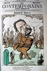 Observator al oamenilor și al faptelor timpului său, Zola s-a implicat continuu prin romanele sale în dezbaterea temelor sociale, artistice și literare, fără să vireze vreodată spre politică. Politicienii i se păreau suspecți și, înainte de afacerea Dreyfus, nu a avut niciodată prieteni din lumea acestora.[53] Republican convins, se avântă de tânăr în lupta contra Imperiului. Primele romane din ciclul Rougon-Macquart au astfel o țintă satirică și politică.[54] După întoarcerea Republicii, cenzura la care este supus începând cu 1872, când publică La Curée(d), îl dezamăgește profund. Cu toate acestea, rămâne un republican fervent, republica reprezentând pentru el „singura formă de guvernământ justă și posibilă”.[55]