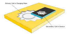 Energia este transferată prin cuplaj inductiv. Un curent alternativ este trecut printr-o bobină de inducție în stația de încărcare sau placă (bobina primară sau de transmisie.) Orice particulă cu încărcare electrică în mișcare creează un câmp magnetic conform cu legea lui Oersted. Câmpul magnetic fluctuează, deoarece curentul alternativ are amplitudine fluctuantă. Un câmp magnetic variabil generează o forță electromotoare cunoscută astfel drept legea de inducție a lui Faraday. Acest fenomen de inducție produce un curent electric alternativ într-o a doua bobină de inducție (receptorul sau bobina secundară) din dispozitivul portabil. Este apoi transformat în curent continuu cu un redresor și utilizat pentru a încărca o baterie sau pentru a furniza energie de funcționare.[1]